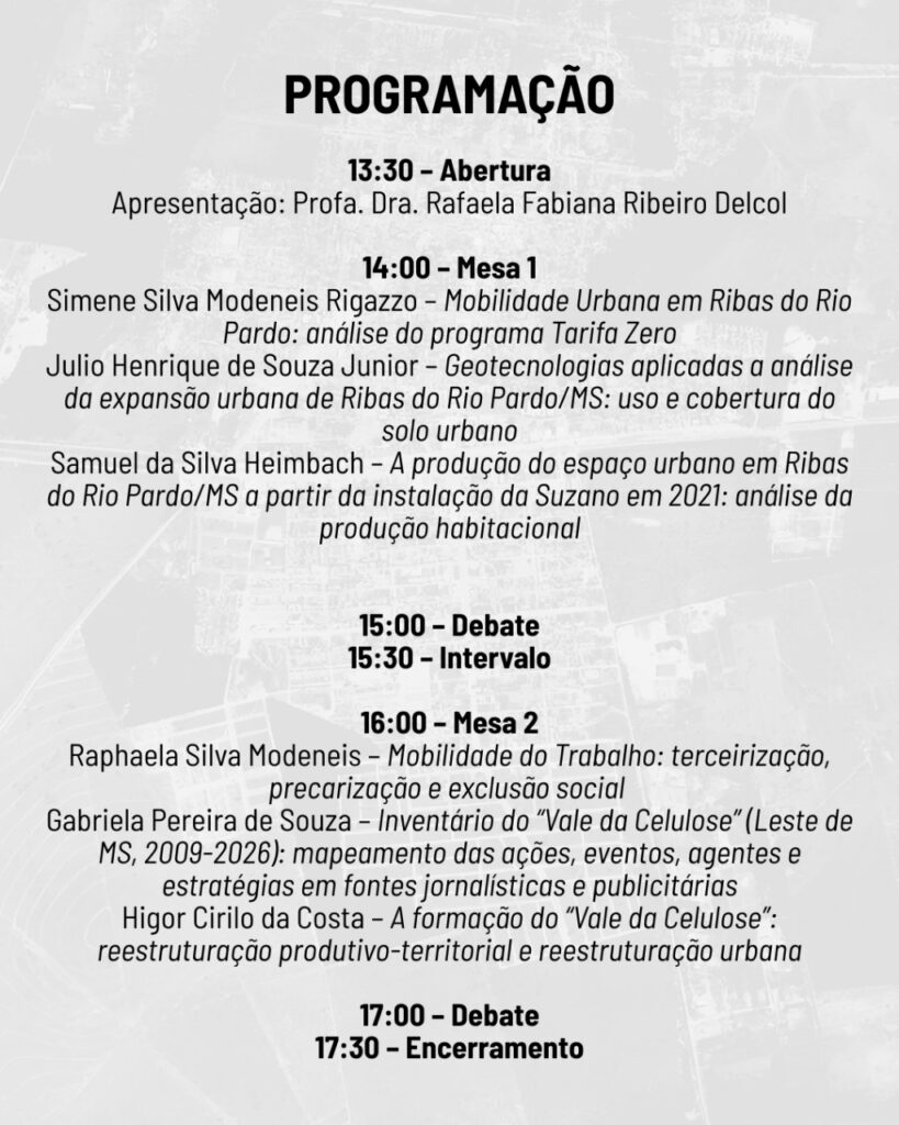 O evento tem como objetivo promover o debate sobre as consequências urbanas, territoriais e socioeconômicas associadas ao processo de expansão da indústria de celulose no leste de Mato Grosso do Sul, reunindo contribuições de diferentes áreas do conhecimento. Será um espaço para apresentação de reflexões, resultados parciais de pesquisa e diálogo sobre dinâmicas contemporâneas de urbanização, produção do espaço e reestruturação de cidades industriais.