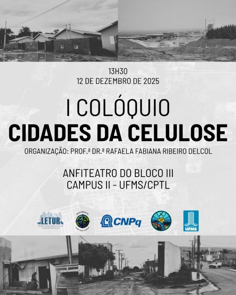 No dia 12 de dezembro de 2025, a partir das 13h30, será realizado no Anfiteatro do Bloco III o I Colóquio Cidades da Celulose, evento organizado pelos membros do projeto de pesquisa Cidades da Celulose: industrialização, urbanização e tensões. A atividade é aberta a estudantes, pesquisadores, profissionais e demais interessados no tema.